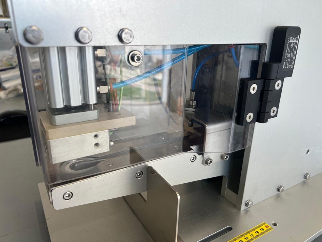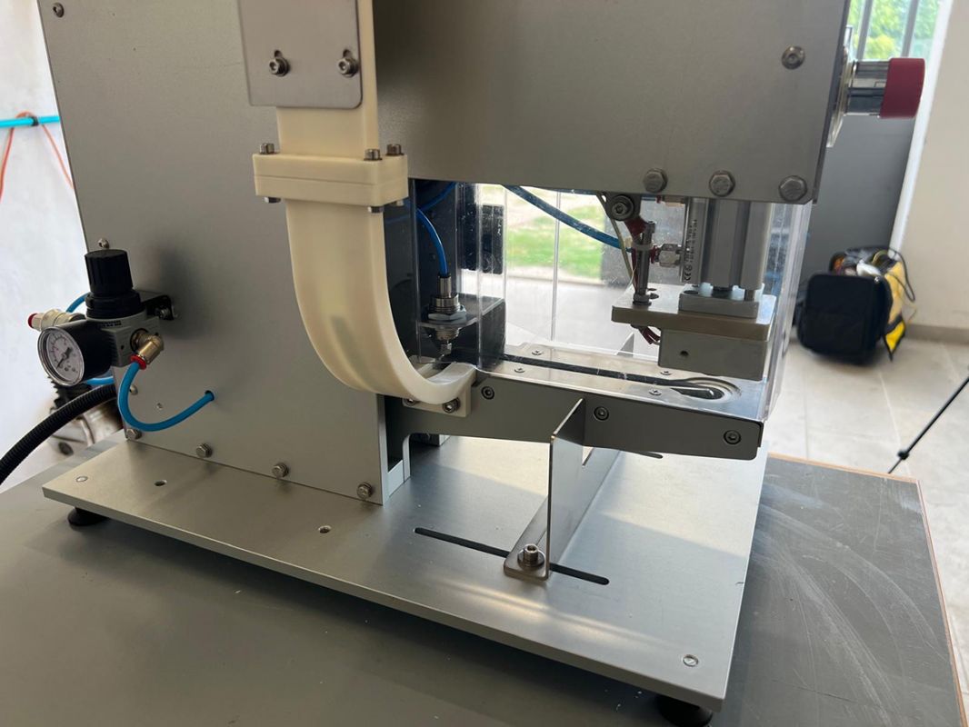 Dispositivo semiautomático para la aplicación de válvulas de desgasificación en bolsas preformadas. La válvula, ingresada manualmente en un dispositivo vertical, se dispone mediante movimientos mecánicos a la zona de soldadura, el operador deberá insertar la bolsa en el área de soldadura que a través de un pulsante a pedal vendrá aplicada la válvula en la bolsa.